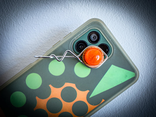 Wir experimentierten zunächst mit dünnem, weichem Draht um uns eine funktionierende Form zu überlegen. Sie sollte zwei Funktionen erfüllen: 1. Eine Klammer, die auf Handys mit unterschiedlichen Dicken aufgesteckt werden...